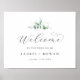 This elegant greenery wedding welcome poster is perfect for a simple wedding. The modern elegant design features a natural botanical arrangement of eucalyptus, leaves and plants with a subtle mint green watercolor wash accent. Customise the poster with the name of the bride and groom, and the date of the wedding.