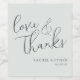 This wine label features a minimalist and elegant design with a focus on typography, perfect for personalising your bottles. The layout includes a cursive script at the top that reads "love & thanks," followed by customisable names and date in a clean sans-serif font. The colour palette is simple, with black text on a light grey background, creating a sophisticated and warm tone ideal for expressing gratitude and celebration. The overall style blends romantic elegance with contemporary simplicity, making it versatile for various formal occasions.