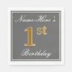 This simple and elegant paper napkin design features a message like "Name-Here’s 1st Birthday" (with the "1st" having a faux gold-like colouring) within a grey-coloured square area featuring a simple border outline. The name is in a white-coloured script-like text, and can be personalised. Napkins like these could perhaps be used at a birthday party for somebody who is celebrating their first birthday. [~Z0000191]