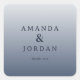 This wedding sticker features a minimalist design with a gradient background transitioning from light grey to blue-grey, creating an elegant and modern look. The clean, sans-serif typography highlights the names in uppercase letters, while "thank you" is subtly included below in lowercase, adding a touch of gratitude. The neutral colour palette and simple layout exude sophistication, making it perfect for expressing appreciation at weddings or other special occasions. Its understated style ensures versatility, fitting seamlessly into various celebratory settings.