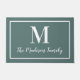 Freshen up your home's entrance with this elegant custom monogram doormat in grey teal blue / green and white colours. Note, colours can be modified. Personalise with your family's last name in script and a serif style monogram initial. Design includes a simple framed border.