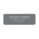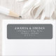 This return address label features a clean, centred layout with ample spacing between lines on a solid grey background. The design uses elegant serif typography in crisp white, creating a sophisticated and formal aesthetic. Its minimalist style emphasizes clarity and simplicity, making it ideal for weddings or other special occasions. The customisable fields allow for easy personalisation, ensuring the label fits perfectly with any event theme.