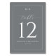 This elegant wedding table card features a minimalist design with a muted grey background, creating a sophisticated and modern aesthetic. The layout is centred, showcasing the number "12" in bold white serif font, complemented by cursive script for the word "table." Customisable initials at the top add a personal touch, while the clean lines and balanced composition convey an air of refinement, perfect for formal occasions.