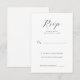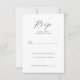 This elegant wedding RSVP card features a minimalist design with ample white space, creating a clean and sophisticated look. The layout includes a prominent cursive "RSVP" at the top, followed by a formal serif font for the response instructions. Personalisation options are seamlessly integrated, allowing for a name and number of attendees to be added. The restrained colour palette of dark grey or black on crisp white enhances its classic style, making it perfect for conveying refinement and simplicity at your special event.