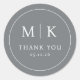 This elegant wedding sticker features a minimalist circular design with a solid grey background. The layout includes prominent initials "M" and "K," separated by a vertical line, followed by the phrase "THANK YOU" in a refined serif font. Below, a date is displayed in a clean sans-serif typeface, adding a modern touch to the classic style. The overall aesthetic conveys sophistication and gratitude, making it perfect for expressing appreciation at your special event.