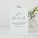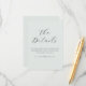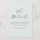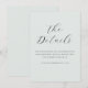 This wedding enclosure card features a minimalist design with a soft, light grey background that creates an elegant and serene atmosphere. The layout is clean and modern, with the phrase "The Details" prominently displayed in an elegant cursive script at the top, followed by straightforward instructions in a readable serif font guiding guests to visit a customisable website for more information. The typography balances sophistication and clarity, making it perfect for formal occasions. The overall mood is professional and inviting, ideal for providing essential details while maintaining a refined aesthetic.