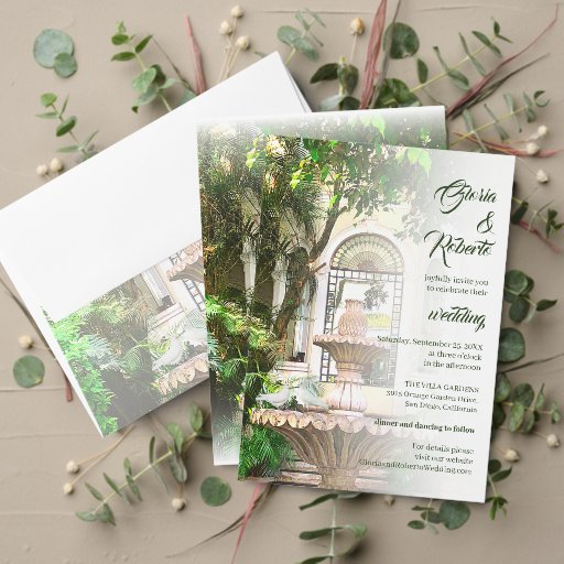 Drawing inspiration from the timeless beauty of Mexican haciendas, this all-in-one invitation showcases a serene fountain with two white doves perched gracefully on the stone, set against a soft and understated lush hacienda patio backdrop. The elegant typography evokes a sense of nostalgia and tradition, balancing modern sophistication with the essence of Mexican architecture.