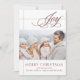 Elegant Hand Scripted Joy Holiday Card. Send beautiful family greetings with this elegant gold and red Christmas card. Card features beautiful hand scripted Joy in red with gold intersecting lines reminiscent of an elegant gift. Easily add your family photo or new baby photo in place of the stock photo, for a personal touch.