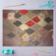 Bold geometry meets delicate botanical beauty in this richly layered harlequin diamond design. Deep crimson, soft gold, sage teal, and warm cream diamond shapes are interlaced with a shimmering gold lattice and adorned with scattered peony and rose blooms, all set against a warm mauve background with subtle linen-like texture. The result is a design that is simultaneously graphic and romantic — dramatic enough to command attention, refined enough to complement any vintage or maximalist interior.