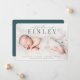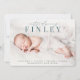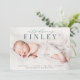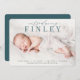 An elegant birth announcement design featuring a full bleed horizontal or landscape orientated photo with "introducing [name]" at the top in chic calligraphy script and classic serif lettering. Your baby's full name, birth stats, and your family signature appear along the bottom. Add three additional square photos to the back.