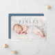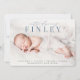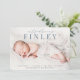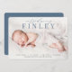An elegant birth announcement design featuring a full bleed horizontal or landscape orientated photo with "introducing [name]" at the top in chic calligraphy script and classic serif lettering. Your baby's full name, birth stats, and your family signature appear along the bottom. Add three additional square photos to the back.