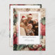 Elegant watercolor style floral pattern featuring assorted Christmas botanicals in white, burgandy red and green, with opaque bordered photo template. Back features editable text fields.