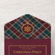A luxurious blend of dark cranberry red and gold tone sets a scene of timeless elegance, beautifully contrasted by a rich, classic plaid on the top inside flap in shades of dark cranberry red, dark teal green, and deep navy, subtly accented with faux gold threads along with a simple gold tone snowflake encased in a double circle. A simple holly and berries motif framed in a refined rectangular border adds a traditional touch to the front centre—creating a striking yet understated Christmas party invitation that’s ready to shine with your personal details. The bottom features your single photo along with your seasonal greeting, the year and name(s) in gold tone. The outside (back) features a contrasting dark teal green overall background and faux gold text to coordinate with the inside. Your return address is accented by an emblem created with the holly motif and your monogram initial in centre. Perfect for your holiday gatherings from personal to corporate celebrations.