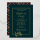 A luxurious blend of deep teal green and real gold foil sets a tone of timeless elegance, beautifully contrasted by a rich, classic plaid in shades of burgundy, dark teal green, and deep navy, subtly accented with faux gold threads. A simple holly motif framed in a refined rectangular border adds a traditional touch to the front—creating a striking yet understated Christmas party invitation that’s ready to shine with your personal details. Perfect for your holiday gatherings from personal to corporate celebrations.