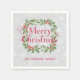 Spread holiday cheer with these elegant Merry Christmas Napkins. Featuring a classic holly wreath design with vibrant red berries and green leaves, set against a subtle grey background adorned with delicate white snowflakes.