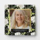 Celebration of life square photo plaque featuring a stylish black background, elegant white botanical flowers, a photo of your loved one in a faux gold frame, their name, and birth/death dates.