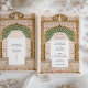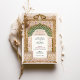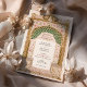 This luxurious wedding invitation showcases an exquisite Indian-inspired arch design, intricately adorned with floral and gold detailing. The symmetrical peacock feather motif in lush green and gold hues creates a regal and timeless aesthetic, reminiscent of royal palaces in India. Surrounding the arch, delicate floral embellishments in soft pink and cream add a romantic touch, making this design perfect for an elegant and culturally rich wedding celebration. The sophisticated typography enhances the invitation’s refined charm, making it an ideal choice for destination, traditional, or fusion weddings.