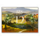 Wedding table number card featuring a painting of a Tuscan Italian landscape. A colourful hilly landscape scene with fresh greenery.