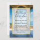 This elegant Italy or destination wedding invitation features a photographic image of the arches of the Villa Balbianello in the city of Lenno on Lake Como, Italy. This is the perfect invitation for an Italian style wedding or for a couple who loves Italian architecture. Featuring the colours of blue, green, and gold, this unique invitation has the same photo on the back with your names and wedding date. Easy to personalise with your own names, wedding date and information, and features a white overlay with gold border and hand lettered script.