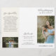 Modern photography trifold brochure featuring a photo on the front with your business name above and the brochure title below, over a white background. The outside back panel has your contact information with the header in an elegant handwritten font. The inside fold panel has a template for information along with a photo on the bottom over an ivory cream background. The inside has one picture on the left and right panels along with a template for information on the left, your packages in the middle and an A la carte price list on the right panel. This professional trifold brochure is perfect for a wedding photographer.