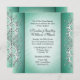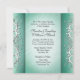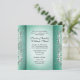 This gorgeous invitation has two columns on either side creating a border with white frill accents. It is a shade of what I can best describe as jade green . Text on both sides. Names and date can be added to the first side.