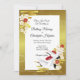 The invitation is decorated with 2 cranes, white and red plum blossoms, mums and cherry blossoms which are all celebratory elements for celebrations in the gradient of gold backgound. All of the texts are customisable. This is a digital illustration.