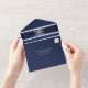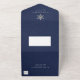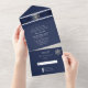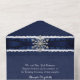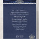 Elegant Winter wedding tri-fold all in one invitation done in a dark blue damask. Graphics of a rich dark blue satin looking ribbon with white lace edges, runs across the top of the invitation and is decorated, in the middle, with a silver tone and diamond looking snowflake jewel. Personalise the custom text to suit your needs. Chose from many different card stock options for the look you like best. Matching products available.