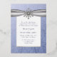 Chic winter wedding invitation done in an ice blue damask background. Graphics of a silvery white satin looking ribbon, runs across the top of the white text area and is decorated, in the middle, with a silver tone and diamond looking snowflake jewel. Personalise the real silver foil text to suit your needs.
