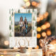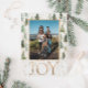 An elegant and festive design with a green, gold and white colour theme. Green pine trees with scattered gold glitter adorns a framed photo to share with loved ones. The word Joy adds a touch of cheer and sophistication with a classical font in a simulated gold colour. The backside has a customisable message in black text with the word love in a solid gold colour.