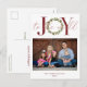 Elegant Joy to the World Christmas Wreath Holiday Photo Postcard featuring your family photo and the classic Christmas carol in modern typography with a festive holiday wreath. A fun, festive way to send your Christmas cards this year! Please contact us at cedarandstring@gmail.com if you need assistance with the design or matching products.