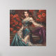 An exquisite pastel-style painting of a beautiful woman wearing an elegant teal corset dress adorned with floral embroidery. She stands gracefully surrounded by vibrant red poppies, holding a flowing purple shawl, evoking a romantic and vintage atmosphere perfect for artistic and fashion designs.