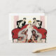 Elegant Lady in Paris postcard. Art deco illustration from 1924. French illustrator Georges Barbier completed dozens of beautiful illustrations depicting the roaring twenties in France. Elegant Lady in Paris features a young blonde woman sitting on a couch as two suitors in tuxedos flirt with her. The woman wears a pink gown and holds a pink feather fan while above them sit pink curtains. A great gift for fans of art deco fashion, vintage art, and Georges Barbier.