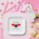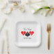 Elegant Las Vegas wedding party decoration. Custom Paper Plates. Square or round shape. Personalise with your own custom text. Classy design template with red and black playing card suits plus monograms. Also great for luxury engagement, anniversary, bridal shower or bachelorette celebration. Hearts and spade icons with date of marriage and destination. Trendy table decor for newly weds couple getting married in Nevada or having the gambling theme.