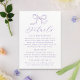 Let guests know everything they need with this charming lavender bow wedding details card. Featuring a hand-drawn lavender bow above your custom text, this card is ideal for sharing accommodation details, directions, weekend events, or wedding website. The white background and romantic lavender hue suit spring, modern, or garden-inspired weddings beautifully.