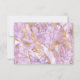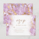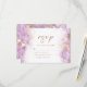 The edges of this elegant modern RSVP card features a lavender watercolor border design in imitation of marble veined with faux gold foil, fading gradually into the white background. The letters "rsvp" appear in gold-coloured handwriting script. The customisable response date and wording are in charcoal grey serif text. The reverse side features a matching lavender and gold marble design.