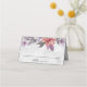 Wedding place card depicts an elegant floral watercolor design with peach and lavender flowers and leaves on a grey background. Features place for names and table number.