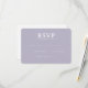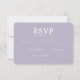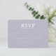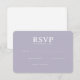This elegant wedding RSVP card features a minimalist design with a soft lavender background, creating a sophisticated and calming aesthetic. The layout is clean and organized, with bold, uppercase "RSVP" text at the top, followed by customizable fields for names and attendance numbers. The choice between "happily accepts" and "sadly declines" adds a touch of whimsy to the formal tone. With its modern sans-serif typography and simple composition, this card is perfect for couples seeking a chic and straightforward way to manage their guest list.
