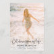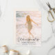 A modern, minimalist full photo order of service funeral program to celebrate the life of your loved one in a minimalist clean simple design style featuring a elegant handwritten script font and a soft pastel peach background. The design template can easily be personalised with your own photo and text to create a special tribute for your loved one's funeral, memorial or celebration of life. The image shown is for illustration purposes only to be replaced with your own photo. The placeholder image shows a happy young woman with wavy long blonde hair wearing an elegant chic pastel floral summer dress standing in the sea at sunset on a sandy beach in the shallow breaking waves. #funeral #orderofservice