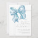 Available as a printed invitation or a downloadable digital invite that can be sent via email or printed locally. Simple Watercolor Blue Bow Baby Shower Invitation Elegant Script Typography.