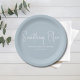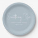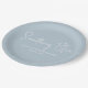Simple light blue plate with 'Something Blue' on it with the bride's name and the event date.