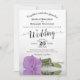 This gorgeous wedding invitation features a modern floral design with a single long stemmed lilac purple coloured rose lying on its side reflecting in a pool with waves and ripples. The design is simple, elegant, romantic and sophisticated, with lacy script calligraphy and fully customisable content.