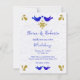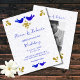 Elegant Love Birds Mexican Wedding Invitation. This Mexican wedding invitation design draws its inspiration from classical blue Mexican talavera and ornamental Mexican tiles. Set against a background that mimics handmade cotton paper, this elegant blue invitation features two love birds with a heart in the centre, adding a romantic touch. The design is further enhanced by golden decorative motifs and traditional figures inspired by artisanal Mexican tiles, making it a luxurious choice for any wedding celebration.