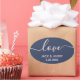 Modern love script in white with a blush pink shadow effect on a navy blue background. On the bottom, the couple's names in a coordinating pale pink in a coordinating font, with the special date underneath, in smaller white font. Cute for wedding favours, sealing wedding invite and thank you card envelopes and for any love themed parties.
