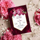 magenta pink and burgundy flowers and leaves wedding invitation. This pretty wedding design showcases a gold frame with a watercolor roses and foliage in pink and burgundy colours. The back is a rose in magenta pink colour.
