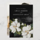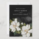 An Elegant Wedding Invitation designed with a White Magnolia illustration on a black background. The back of this card can be customised with your favourite portrait orientated photo. Matching items in our store Cava Party Design