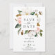 This elegant magnolia white save the date card is perfect for a modern classy wedding. The soft floral design features watercolor blush pink peonies, stunning white magnolia flowers and cotton with gold and green leaves in a luxurious arrangement.