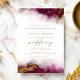 This elegant wedding invitation features a burgundy red watercolor border design in imitation of marble veined with faux gold foil, fading gradually into the white background. The word "wedding" appears in gold-coloured handwriting script, with the remaining text in gold-coloured serif capitals. The burgundy and gold marble pattern is repeated on the back of the card.