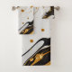 The dominant theme of the towel set is an elegant pattern that intricately weaves together modern and classic elements. The use of marble patterns, both in black and white, creates a timeless and sophisticated feel, while the incorporation of metallic gold accents adds a touch of glamour. This golden touch, combined with shimmery black and white tones, results in a chic and stylish aesthetic that appeals to those with a taste for modern luxury.