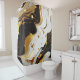 The central theme of the shower curtain revolves around an elegant pattern that seamlessly blends modern chic with timeless sophistication. The incorporation of luxurious marble patterns, primarily in black and white, exudes a sense of opulence and refinement. The addition of golden accents elevates the overall aesthetic, creating a shower curtain that is both stylish and classic.