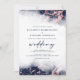 This elegant wedding invitation features a navy blue watercolor border design in imitation of marble veined with rose gold faux foil, fading gradually into the white background. The word "wedding" appears in dark navy blue handwriting script, with the remaining text in serif capitals. The navy blue and rose gold marble pattern is repeated on the back of the card.